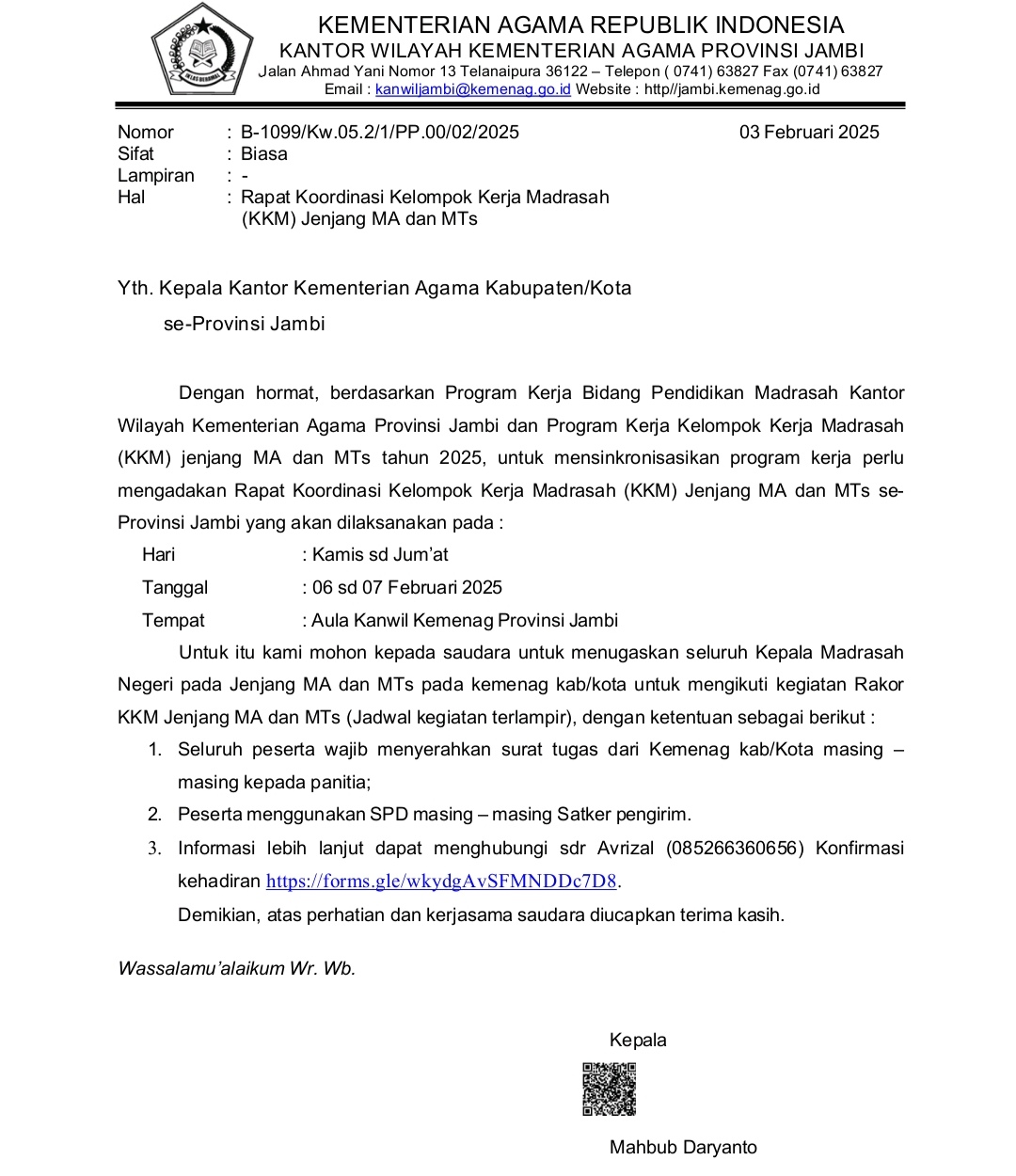 Kepala madrasah menghadiri berdasarkan surat undangan dari Kantor Wilayah Kementerian Agama Provinsi Jambi Nomor: B-1099/Kw.05.2/1/PP.00/02/2025 tanggal 03 Februari 2025 tentang rapat koordinasi kelompok kerja madrasah (KKM) jenjang MA-MTs.