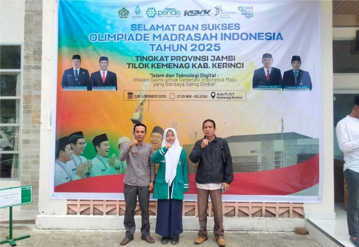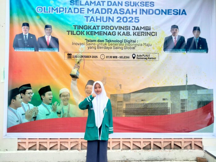 Kerinci (MTsN 4 Kerinci) - Seorang siswa dari Madrasah Tsanawiyah Negeri (MTsN) 4 Kerinci yakni Najwa Syatifa Samad, kembali berlaga di Olimpiade Madrasah Indonesia (OMI) tingkat Provinsi Jambi pada mata pelajaran Ilmu Pengetahuan Sosial (IPS) Terintegrasi jenjang MTs, yang diselenggaran pada Jum'at (03/10), untuk wilayah kabupaten kerinci dilaksanakan di Aula PLHUT Kantor Kementerian Agama Kabupaten Kerinci. Keikutsertaan siswa ini menjadi kebanggaan tersendiri bagi sekolah, karena menunjukkan prestasi dan kualitas pendidikan yang terus meningkat.
