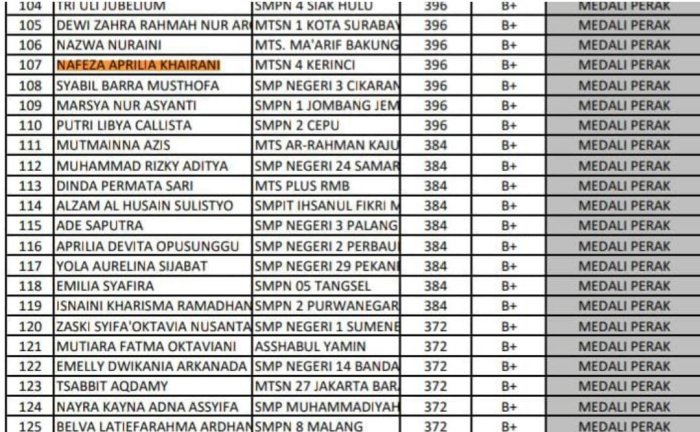 Kerinci (MTsN 4 Kerinci) - Nafeza Aprilia Khairani, siswi Madrasah Tsanawiyah Negeri (MTsN) 4 Kerinci, berhasil meraih medali perak dalam ajang Excellence Student Olympiad pada mata pelajaran Ilmu Pengetahuan Alam (IPA) yang dilaksanakan pada tanggal 10 Oktober 2025 lalu. Prestasi ini menjadi kebanggaan tersendiri bagi madrasah dan keluarga Nafeza, serta menjadi motivasi bagi siswa lain untuk terus berprestasi di bidang akademik.