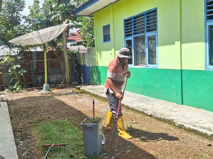 Aksi bersih-bersih ini mencakup pemangkasan rumput, penyapuan halaman utama, hingga pembersihan drainase di sekitar area kelas. Langkah ini diambil guna memastikan bahwa ketika siswa kembali masuk sekolah senin besok, kondisi lingkungan sudah dalam keadaan asri, nyaman, dan mendukung proses pembelajaran.