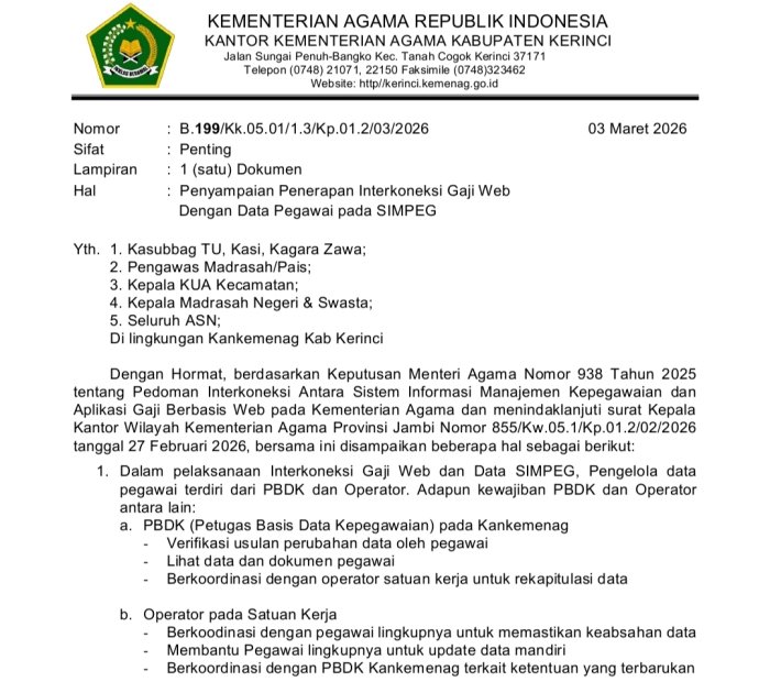 Langkah ini merupakan respon cepat terhadap surat dari kemenag kerinci nomor B.199/Kk.05.01/1.3/Kp.01.2/03/2026 mengenai penyampaian penerapan interkoneksi Gaji Web dengan data pegawai pada SIMPEG.