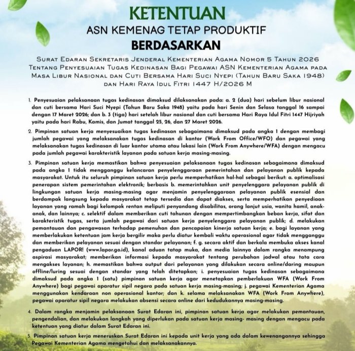 Pengumuman ini merujuk pada Surat Edaran Sekretaris Jenderal Kementerian Agama Nomor 5 Tahun 2026 tentang Penyesuaian Tugas Kedinasan bagi Pegawai ASN Kementerian Agama pada Masa Libur Nasional dan Cuti Bersama Hari Raya Nyepi (Tahun Baru Saka 1948) serta Hari Raya Idul Fitri 1447 H.