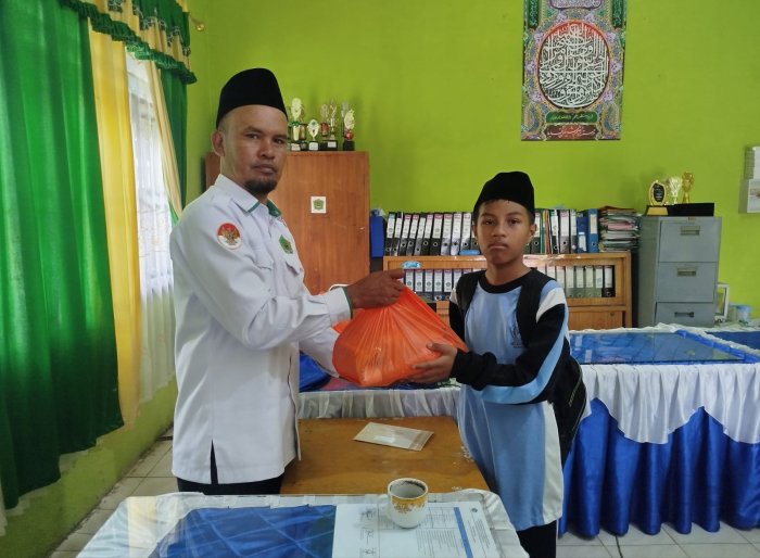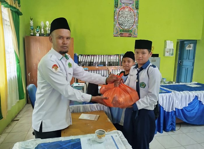 Proses penyerahan bantuan ini diwakili oleh Wakil Kepala Madrasah (Wakamad) Bidang Kesiswaan, Bapak Jamaluddin, S.PdI. Dalam suasana penuh khidmat, paket sembako yang berisi kebutuhan pokok tersebut diberikan langsung kepada para siswa yang telah didata sebelumnya melalui proses seleksi internal madrasah agar tepat sasaran.