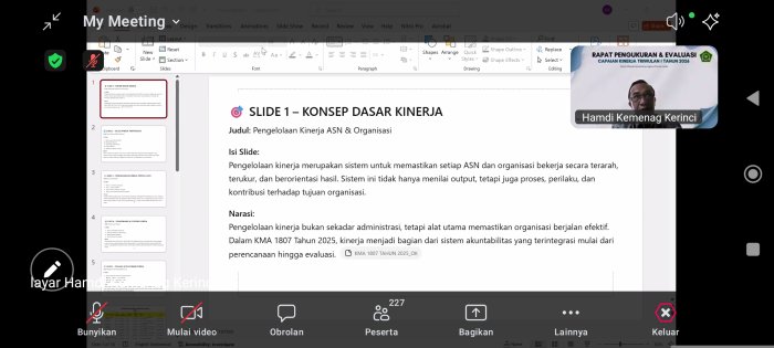 Kerinci (MTsN 4 Kerinci) - Dalam rangka meningkatkan akuntabilitas dan kinerja aparatur sipil negara, Kepala Madrasah Tsanawiyah Negeri (MTsN) 4 Kerinci, Bapak Samsir, S.PdI, bersama Pendidik dan Tenaga Kependidikan (PTK) mengikuti rapat virtual melalui Zoom Meeting pada hari ini Rabu (08/04). Agenda utama pertemuan ini adalah sosialisasi dan koordinasi teknis Penilaian e-Kinerja Triwulan I Tahun 2026.